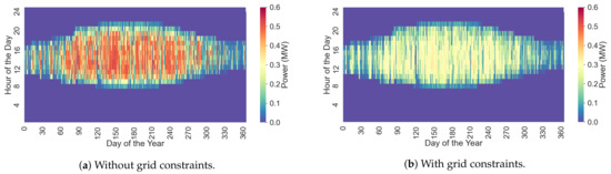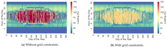 As described in Section 2, in this scenario, a significant capacity of PV is considered to be installed in the system. In Figure 4a, the loading on the main feeder during one year is shown. It is observed that the line can be overloaded up to of its capacity. Figure 4b shows the new line loading after the OPF has generated the corresponding grid constraints at each time step. With the consideration of the violated hours shown in Figure 4a as constraints, the optimization reduces the load in the line at around of its nominal capacity.