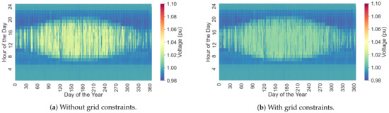 Similarly, Figure 5a,b depict the voltage behavior on the PV bus before and after the grid constraints generation.