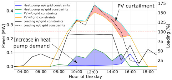 Even though the installed PV capacity has been decreased to 700 kWp for this scenario, the mismatch between the electric demand and the generation will still create energy flows back to the grid. Such energy flows are big enough to overload the main feeder. As the heat pumps and heat storage are considered in the energy system, the optimizer has the possibility to transfer the energy surplus from the PV system into another energy carrier. Figure 7 shows how the line loading constraint due to the high PV feed-in affects the power dispatch of the heat pumps and PV. The flexibilization of the heat pump activation avoids that the locally generated energy leaves the system. This diminishes the energy injected into the grid, avoiding in this manner the line overloading and diminishing the PV curtailment.