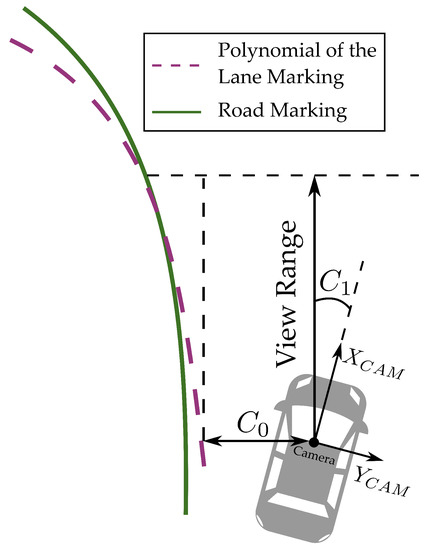 Camera recognition is mainly responsible for detecting road marking. For the current study, our test vehicle is equipped with a MOBILEYE camera series 630, which employs a third-degree polynomial to estimate detected lane markings. Thus, the stored output of the image processing unit is four coefficients for each detected lane marking, the polynomial function is presented in Equation (1).
