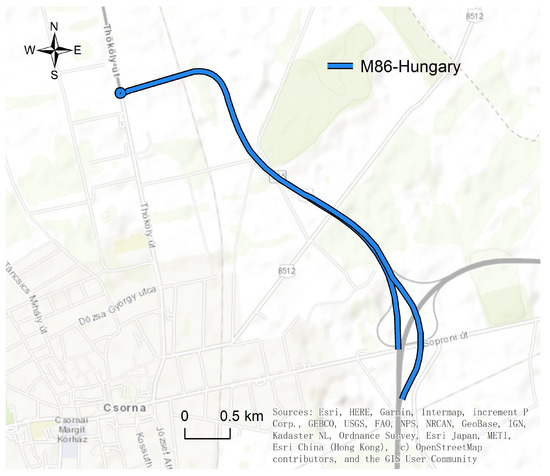 ADMA-RTK combination is a strap-down inertial measurement system. The extended-Kalman filter used in the ADMA can estimate several important sensor errors in order to enhance system performance. Depending on the capability of the GPS receiver, the position accuracy range down to 1 cm. Meanwhile, six inertial sensors provide high accuracy data [40]. Due to the accurate performance of this combination, it is used as a reference system. The measurements and data collection were conducted on the M86 highway in Hungary, see Figure 3. The construction of a close road section facilitates the development and testing of connected and autonomous vehicles. The total length of the test road section is 3.4 km [41].