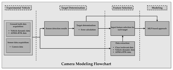 However, due to the low-fidelity provided by the model, the detection performance of a specific sensor cannot be accurately replicated. Therefore, a stochastic model for errors in the position measurement is constructed based on an ideal sensor in [21] where the variation is a random Gaussian white noise. The real detection behaviour is still not reflected by a random error distribution. In order to improve the reality of sensor simulation and approximate the distribution of given measurements or a dataset, non-parametric machine learning approaches can be used. It estimates the outputs and ensures that the shape of the distribution will be learned from the data automatically [22,23,24]. Furthermore, the details of the perception function are usually not accessible to the developer of the automated driving system, i.e., the vehicle manufacturer. The measurement process of a comprehensive physical model is also computationally expensive. Accordingly, a statistical model of the perception process is proposed. Examples of statistical models can be found in [25,26]. In these models, the measurement and reference data drive the construction of the sensor model, where errors are calculated between data and the probability functions map the errors to reference data as the outputs of the model [27]. This approach can implicitly depict several sources of error. In contrast to previous techniques, the resulting sensor output distribution is no longer limited to a specific set of distributions. This statistical model was also employed in [28] as a lane marking detection model, where a direct relationship between sensing distance and error was developed by measuring errors of a real camera system [22]. These models only take the measurement error of the camera and ignore the impact of environmental and vehicle dynamic movement on the results. Hence, it is impossible to predict the output correctly based on the vehicle’s current status.
