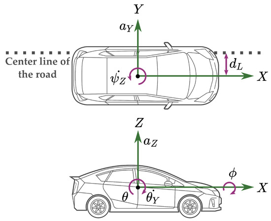 These coefficients are explained in Table 1. Since our test scenarios are primarily focused on straight segments of the highway, and are ignored. However, is the lateral distance to the detection lane marking at the height of the camera. indicates the vehicle heading relative to the lane heading and the road markings on the measurement section are symmetrical, implying that values for the left and right lane markings are identical. As a result, this paper will only focus on and estimation, as shown in Figure 1.
