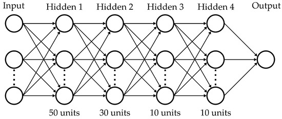 The number of layers in the network and the number of neurons in each layer are typically determined empirically. By comparing training result performances, four hidden layers were decided to be utilized in the MLP model, with the number of neurons distributed as 50, 30, 10, and 10 in each layer. The architecture of hidden layers and the number of neurons in each layer are used for both prediction models (-LPE and -HAE estimation). As shown in Section 4.2, the number of inputs for each target is shown in Table 2.