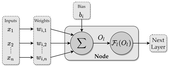 Finally, multiple nodes and hidden layers build up the MLP, as shown in the Figure 6. The output of each node is forwarded to the next layer to continue the same operations. The output layer of the entire network is defined by Equation (4), where output calculates the weighted sum of the signals provided by the hidden layer. The coefficients associated with them are grouped into matrices and .