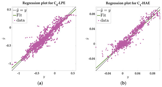 As discussed in Section 4.1 and Section 4.2, the MLP model is used to estimate -LPE, which consists of five features and a two-dimension target. The combination of five input features and a one-dimension target is used to estimate -HAE. The regression graphs obtained as results of the MLP training are given in Figure 8. The models are evaluated for the test set after convergence, and regression accuracy can achieve 94.0% and 95.5%, respectively, for -LPE and -HAE estimation in order to further evaluate the estimation model, where evaluation metrics (MSE, RMSE, and R) measure regression performance. As a result, MLP training performance is provided in Table 4. The results show good agreement between actual and estimated values, and the prediction errors of the results are within an acceptable range. The models are more consistent with the trend of real values in terms of the predicted value. Therefore, the training of the network has been successfully provided.
