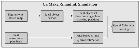 In this section, a test run is randomly selected from the test set samples carried out in the co-simulation based on the Carmaker-Simulink software, which provides a multi-body simulation environment that includes vehicle dynamics control and sensor modules. These modules can support custom modifications. Thus, PLDM replaces the default camera model in CarMaker and tests detection performance in a virtual environment. As illustrated in Figure 9, the entire model is integrated into the co-simulation platform. Realistic reproduction of the virtual scenario is produced using the digital twin-based M86 map. Subsequently, at each time step, the ideal CarMaker object sensor detects the object from the map and provides precise information feedback in list format. In particular, test run data from previous tests conducted in a real-world environment, such as vehicle dynamics and positioning information, are stored in an external file that could be utilized as input for free movement in CarMaker. This module is mainly responsible for real measurement playback, and necessary data are transmitted to the MLP-based error estimation module, where the estimator predicts the corresponding error values for -LPE and -HAE, respectively, based on the current vehicle state. Due to the fact that the MLP model was trained on prior training data successfully, ground-truth lane marking data are manipulated according to the model’s output. In this case, two polynomial coefficients (-LPE and -HAE) of lane marking detection can be determined.