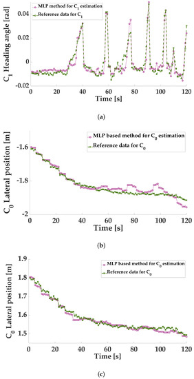 Simulation result for and estimation. (a) estimation comparison between camera detection data and MLP based output. (b) of left lane estimation comparison between camera detection data and MLP based output. (c) of right lane estimation comparison between camera detection data and MLP-based output.