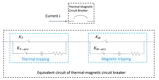 Following the operational principle of TMCBs, an equivalent circuit is described in Figure 2, the switches and are both closed, and the switches and are both open under normal operating status. Thus, the circuit breaker works as a shorted wire with negligible resistance. As thermal tripping occurs, the switch opens and the switch closes, while switches and keep their original status. The switch opens once again when the current reaches zero. During the thermal tripping, if the fault or the overload is instantaneous, and self-cleared before the internal heat energy exceeds the threshold that deflects the bimetal, the accumulated internal energy shall be released, and the circuit breaker remains in normal operating status. On the other end, when a fault current level is high enough to trigger the magnetic tripping mechanism, the switch opens and closes immediately. The switch opens once the current reaches zero. During the magnetic tripping process, switches and keep their original status.