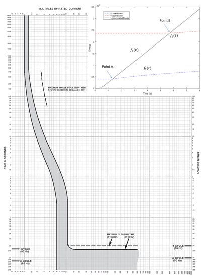 When a fault occurs, the fault current will exceed the rated current of the fuse quickly. After this, the heat energy will start to accumulate, and the exact melting/thermal-tripping time should fall into a time interval, which is regulated by the upper- and lower-boundary of the catalog energy with respect to time. We use Figure 3 to make the demonstration easier to understand (here we use the TCC of Square D QOB-3100 Circuit Breaker [] as an example).