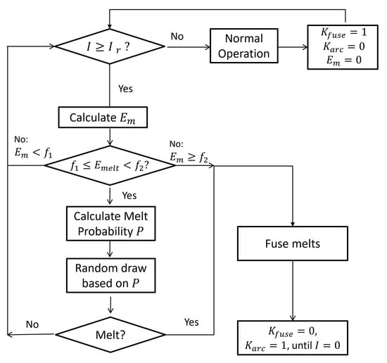 When a fault occurs, by (1), the integral energy () will rapidly accumulate, and after a certain period of time, the integral energy will exceed the lower-boundary (for example, it is denoted as the minimum clear time in []) of the catalog energy, i.e., , where is the corresponding time stamp. From this time point, we consider there is a probability that the fuse will melt. Therefore, a random draw will be initiated based on this probability. If the result is “positive”, then we consider the fuse is melted, and the arcing procedure starts; if the result is “negative”, then the fuse is not melted, and this probability will increase with time following the PDF in (8), unless the fault is self-cleared. As integral energy reaches the upper-boundary (for example, it is denoted as the total clear time in []) of the catalog energy, i.e., , we consider the melting probability increases to , and the fuse must melt. It is worthy to point out that, due to the failure rate, we will allow the existence of outliers after the melting probability reaches 100%. Moreover, if the fault or overload current is self-cleared before the fuse melts, we consider the heat energy that stores within the fuse is released instantaneously based on Assumption 1.