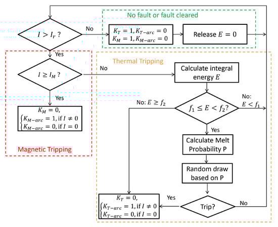 A TMCB has two major protective functions: the thermal tripping and the magnetic tripping. Determined by the fault current level, either of these two functions may be triggered to cut off the faulty circuit and protect the power devices. An operational flow chart of the circuit breaker simulation model is therefore sketched in Figure 5.