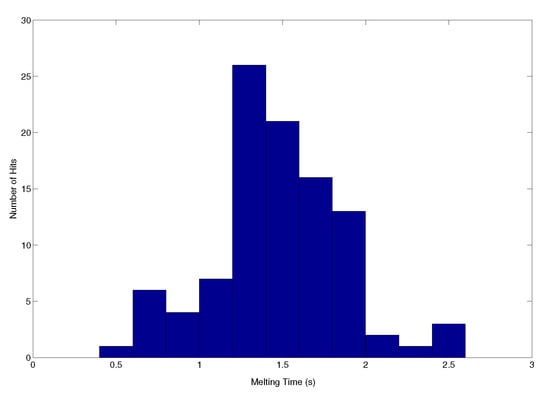 To demonstrate the probability specifications, we repeated this test for 100 times, and the random sample of the fault clearing time is summarized in histogram and boxplot, as shown Figure 8 and Figure 9, respectively. It can be noticed that most of the melting times are concentrated in between 1.2 and 2 s, with a median of 1.42 s, which revealed the customized distribution characteristics. Among these 100 tests, 94 results hit the (0.7, 2.1) second time intervals, which can be found from the minimum and the total clearing times, respectively at 2000-amp, according to []. There were two trials where the fuse melted before 0.7 s, and four trials where the fuse melted after 2.1 s. The number of failed tests indeed matched our assumption of the failure rate.
