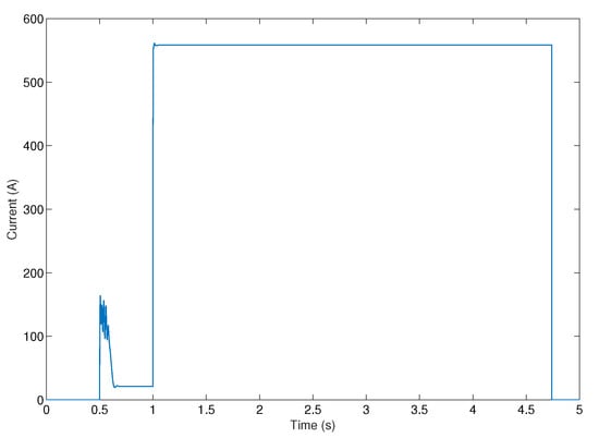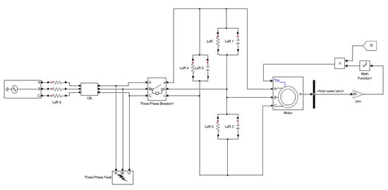 Then, we put the customized model in a simulation testbed using MATLAB/Simulink. We deployed an induction motor in this testbed as shown in Figure 11. In this test, we attached an induction motor to the ac voltage source. The motor is set to start at s, and a short-circuit fault is set to occur at s. This type of TMCB has a rated current of 100 Amps. The TMCB allows a short-period overcurrent to pass; in this test, we observed two types of overcurrent: the inrush current when the motor starts and the fault current.