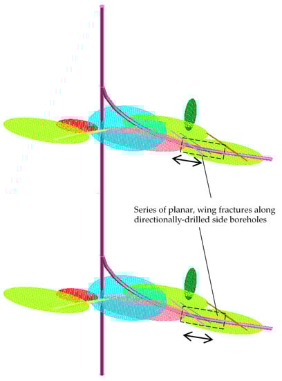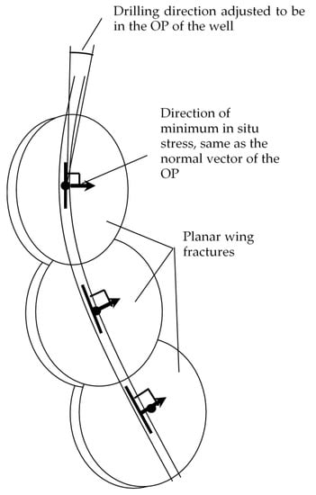 The new REGS arrangement and its method of construction are disclosed and published elsewhere [,,]. A brief synopsis is recalled for convenience regarding the creation of REGS, as follows: (a) directional drilling; (b) wing-type fracturing; (c) testing for the connectivity of each planar wing fracture with the well; (d) continuation of the construction and testing of a series of wing fractures along the directional drilled well; (e) the well direction is adjusted, if needed, to the planar directions of the fractures; and (f) the completion of a series of wing fractures with zonal insolation in each planar fracture by the injection of a grouted or propped blocking island between the intake and the extraction points of the wing fracture section. The key to the creation of a series of large, planar, wing fractures is a directionally-drilled well to follow each major, planar fracture, intersecting it at multiple points around a section at which the fracture approximates the osculating plane (OP) of the well, as shown in Figure 1 and Figure 2.