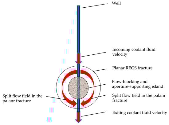 The key to geothermal energy extraction from the contact surface area of the planar wing fractures is an efficient coolant flow system inside the opened void space. Such a flow system in an REGS fracture is illustrated in Figure 3, showing the incoming and exiting coolant flow velocities in the well, as well as the overall flow directions inside the void space of the planar fracture. As depicted, the coolant fluid flow is separated into two wings by the multi-functional flow-blocking and aperture-supporting islands at the center. The blockage is advantageous for preventing a straight flow pass both through the central well section and through the open fracture zone along the shortest distance.