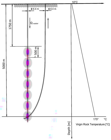 The input parameters for both the single and the twin arrangement examples are chosen to be representative of the common geological formations of ordinary crystalline, e.g., granite type base rock. The input data used for the study are given in Table 1, following previous numerical simulations in various geothermal energy extraction examples [,]. A deep REGS of 5000 m is assumed, with a moderate thermal gradient of 0.033 °C/m in the host rock. The thermal properties of the host rock strata are close to the typical values of granite, the most common target crystalline rock type for EGS applications. The yearly average rock temperature at the surface is chosen at 10 °C, from which a linearly increasing virgin rock temperature with depth is used to model the strata heat reservoir. The coolant fluid temperature is assumed to be 30 °C, kept constant as the exhaust temperature from an Organic Rankine cycle [] (Hijriawan et al., 2019) or a Kalina Cycle [] (Nemati et al., 2017). The assumption is conservative, applying low- to moderate-temperature energy-recovery turbines in the expected intake temperature range of 100 °C to 175 °C at the electrical power plant throughout a 30-year operating time period.