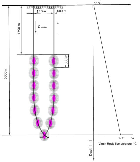 Two arrangements were tested by numerical simulation for the energy extraction capacity and thermal drawdown during operation. The first layout of the geothermal energy extraction arrangement, shown in Figure 4, assumes the application of seven planar, circular REGS fractures in a series along an injection well and a return well with thermal insulation along its length for retaining its thermal energy. The second layout, shown in Figure 5, is a twin fracture series arrangement with six additional REGS fractures along the lower part of the returning well, whereas the last 1750 m section of the well is thermally insulated.