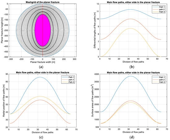 The coolant fluid passes down in the intake well (down well D1) to the first planar REGS fracture at the depth of 1750 m un-insulated, picking up some heat from the warming rock strata as it increases in depth. At this point, the open well intercepts the planar fracture void space (D2) and the coolant fluid flow spreads into various flow paths in the REGS fracture. Figure 6a shows the paths of the entire flow network in the planar fracture. Each line segment of the network represents a fluid flow connection channel. The nodes of the network (i.e., the vertices of the connected segments) represent flow junction connections. The coolant fluid in each channel section is driven by the pressure difference between connecting nodes, created by the forced circulation. The three main flow paths in the planar fracture are shown as ellipsoids. The fan-type flow paths are assumed to be symmetrical on the left and the right sides, according to the mesh grid of the flow network. The three main flow paths on either side are demonstrated according to Figure 6b,c, showing the differential lengths of the network sections and the radial extension of their centers’ positions from the centerline, respectively. The available surface area for heat exchange on either side of the planar fracture along each flow path is shown in Figure 6d.