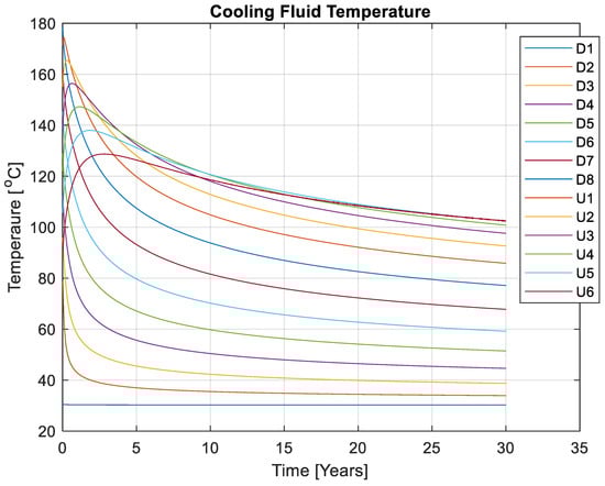 Cooling fluid temperature along production time through the circulation loop from downwell D1 through seven REGS fractures from D2 to D8; followed by upward U1 through six REGS fractures to U6.