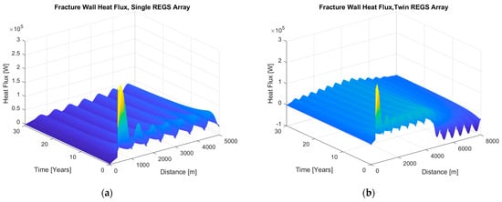 An internal heat exchange along the fluid circulation loop can also be seen from the heat flux distribution along the surface wall pixels of the REGS fractures as a function of space and time (shown in Figure 8a,b) for the single and the twin REGS arrays, respectively. While the heat flux distribution shows a positive gain everywhere along the single REGS array with the downward flow and increasing virgin rock temperature, the twin array confirms expected negative fluxes through the heat loss from the coolant fluid during the first few years along the upward REGS fracture zones, and heat gain at the later time period at the same zones.