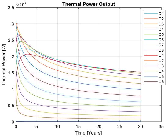 The relevant result for the thermal power capacity of the geothermal reservoir is the heat flux variation with time exploited from the hot rock strata by the coolant fluid, shown in Figure 8. The process, often referred to as the thermal drawdown, is time-dependent for both the single REGS array and the twin REGS array arrangements.