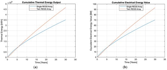 The net cumulative electrical energy value is shown in Figure 10b, and is calculated by the temporal integral of the gross power output capacity of the reservoir, multiplied by an estimated Carnot energy conversion efficiency of 0.21 and an energy cost rate of $0.1/kWh, a similar value to those applied by Cui et al. for a single-well EGS system []. As depicted, $70 M and $90 M electrical energy market value can be obtained from the single and the twin array REGS reservoirs, respectively, by the end of the 30-year production time period.