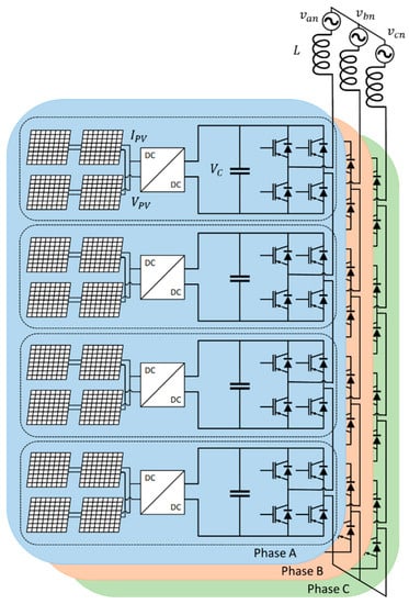 Thus, topologies with modular capacity, such as the CHB topology [9,10,11], have gained attention lately because they allow devices to operate with lower voltage, obtaining a final output that may be several times higher. Indeed, the modular nature of the CHB topology is at the root of its potential scalability, providing a more efficient maximum power point tracking (MPPT) feature than their two-level counterparts [12,13].