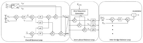 In the last few years, VOC control has been widely used to control CHB converters and forms the basis of other control strategies [21,22,23,24]. Figure 2 shows a VOC control scheme, which includes the zero-sequence vector injection, applied to an N cell per phase CHB grid-tied converter. There are three different sections in the control scheme: the overall balance loop, the inter-phase balance loop and the inter-bridge balance loop. The first one regulates the equivalent DC voltage bus, which is the sum of the voltage of each capacitor, generating the direct current reference and performing the current control loops. The quadrature current reference is set according to the reactive power requested by the grid controller [27]. The central section generates the zero-sequence vector that modifies the voltage references to compensate inter-phase imbalances and, in the last one, 3N PI controllers regulate the capacitor voltage of each cell.