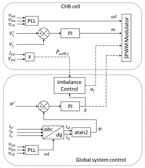 The scalable control strategy proposed focuses on the parameters included in bipolar sinusoidal PWM (B-SPWM) modulation [28] of the H-bridges. These parameters are the electric angle (ωt), the modulation index (m) and the phase delay (δ). The electric angle guarantees synchronization with the grid, while the modulation index regulates the active power delivered by each cell to the grid, which is mostly equal to the power generated by the photovoltaic panels. The phase delay, which is the same for all cells, controls the power factor of the whole system.