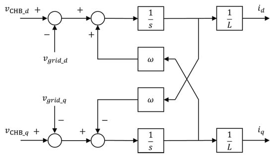 In the block diagram shown in Figure 6, vCHB d, vCHB q, vgrid_d and vgrid_q are the voltages generated by the converter and the grid expressed in the dq frame, is the grid frequency and is the grid connection inductor. If the d-axes is aligned with the phase A voltage of the grid and the phase currents (iA, iB and iC) are then given by Equations (22)–(24) as follows: