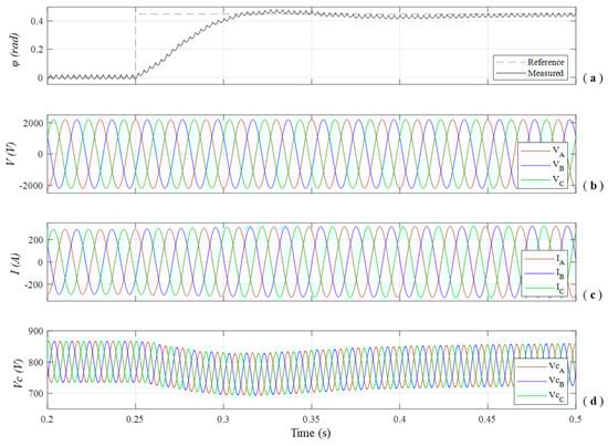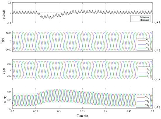 In the first scenario, the system tracks the angle that determines the power factor and the transition takes place smoothly, as can be seen in Figure 8a–c, in which the reference tracking, grid voltages and injected currents are shown, respectively. Additionally, Figure 8d shows a perturbation in capacitor voltage that demonstrates that the control variables are not totally decoupled, as explained in the power factor control section. However, the perturbation does not affect system performance while the controllers are working independently because capacitor value limits the voltage drop to less than 35 V, which is less than 5% of the reference value. This, in turn, is better than the approximation because of the CHB cell controller action.