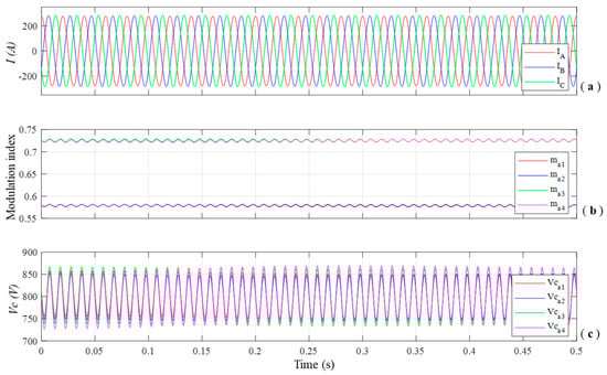 Additionally, Figure 11a shows that three phases share the power evenly among them and keep the injected currents balanced in an unequal power scenario, while Figure 11b,c proves that each cell can adjust their modulation index to regulate the power delivered via the control strategy proposed, keeping the capacitor voltage stable. Therefore, it is not necessary to use an inter-module balancing controller that reduces the scalability dramatically and control strategy proposed is able to implement the zero-sequence vector injection technique described in [24] correctly.