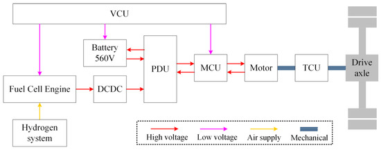 As the research objective in this paper, the configuration of the FCHV heavy-duty truck is illustrated in Figure 1. The parallel FCHV consists of a fuel cell engine system, DCDC, hydrogen system, power distribution (PDU), battery, motor controller unit (MCU), motor, vehicle controller unit (VCU) and other components. DCDC converter plays a significant role in addressing the voltage difference between the output voltage of the fuel cell engine system and the battery system, which ensures not only that the vehicle drive motor always works in the best working range but also that the fuel cell output voltage is unaffected by other external conditions. The working principle is detailed as follows. Hydrogen and oxygen in the air undergo an electrochemical reaction in the fuel cell engine system. Then, the generated electric energy is boosted by DCDC, which is combined with the power battery and transmitted to the driving motor, thus driving the vehicle. At this time, the excess electric energy is transferred to the power battery for storage. The main parameters of the vehicle are listed in the Table 1.
