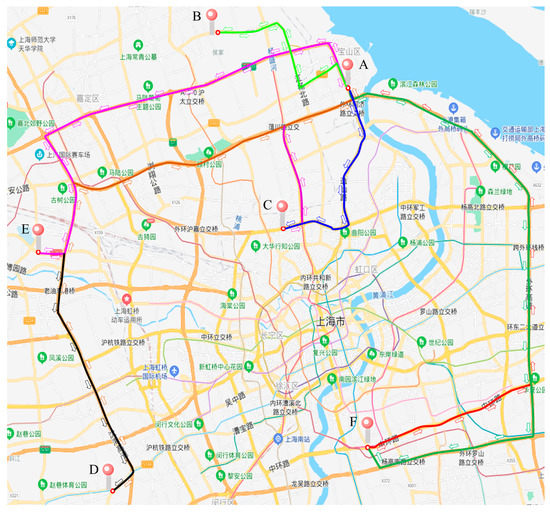 Based on the above-mentioned methods, it is necessary to monitor and manage the vehicles for at least one month in order to capture sufficient characteristics of vehicle speed along the route. In this paper, the database of five vehicles was downloaded from the Internet of Vehicles, and the vehicle daily driving route in Shanghai is shown in Figure 2. The driving route of the vehicle stretches between two points, such as A and B; A and C; A and E; and A and F. A denotes the starting point, which is in Baoshan district, while B, C, D, E and F refer to the different destination points of the five vehicles, respectively. More details about the five-point vehicles can be found in Table 2, including urban road distance, expressway and highway distance, traffic lights, vehicle license plate and vehicle position.