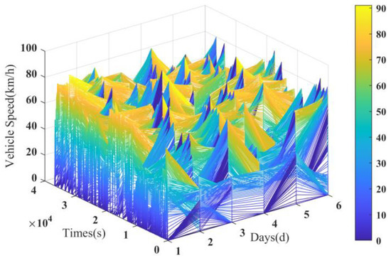 The driving data collected for six days are shown in Figure 3, which includes working time and speed information of the vehicle in a week. It can be observed from the figure that the average daily working time is 10 h. The mean speed does not exceed 40 km/h on urban roads. Moreover, the mean speed does not exceed 65 km/h on the expressway and highway. Obtained by using the vehicle speed integration process, driving mileage can reach up to 350 km. By using an analysis of the six-day driving data collected from different vehicles, it can be observed that a fixed speed characteristic is reflected in different road sections. In the next section, collected data are processed by using data analysis as preparation for the subsequent prediction of speed.