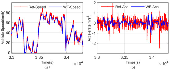 According to the above-mentioned step, vehicle speed and acceleration compared with the reference data curve are determined by wavelet decomposition, respectively. Figure 4 shows a certain section of the entire working condition. The red curves are the original vehicle speed and acceleration, respectively. The blue curves (WF) are the results based on wavelet filtering. It is evident that most of the vehicle speed spikes have been blunted, with the acceleration reflected in real time. Finally, the signal was reconstructed, and complete driving conditions were obtained.