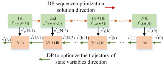In order to resolve the nonlinear optimization problem as mentioned above, the dynamic programming (DP) algorithm based on the Behrman optimization principle is employed. The process of DP is detailed in Figure 7. Herein, s indicates the state variable (), u denotes the control variable () and refers to the cost function of the k-th step time, which can be calculated by Equation (17).