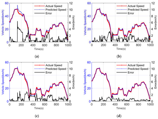 The red line in Figure 8 indicates the reference vehicle’s speed, while the blue and black lines represent prediction results and absolute value of the prediction error, respectively. Upon a comparison between (a) and (b), it can be found that BP-NN has more significant errors than LSSVM. Obviously, the LSSVM prediction model had higher accuracy when the vehicle was in the deceleration phase (259 s–288 s), which indicates that LSSVM exhibited greater sensitivity to the change in speed. Distinctly, the BP neural network prediction model produced a better effect when the vehicle was in the fluctuation phase (800 s–864 s), indicating that BP neural network performed better in fitting given the local variation. Thus, it can be judged that both of the prediction models have the advantages of their own. As for the overall effect of the error simulation, however, LSSVM algorithm had a less significant error, suggesting better generalization ability than the BP neural network. Figure 8c shows APSO-LSSVM optimization results. Upon a comparison between Figure 8b,c, it can be found that the effect of error simulation is basically the same. Both of them can follow the reference speed strictly. Figure 8d presents a diagram showing closed-loop vehicle speed prediction effects. Compared with other diagrams, it can be clearly observed that the predicted curve almost overlaps with the reference curve, with the error falling below 1 km/h. By comparing high-speed area with the low-speed area, it can be discovered that the accuracy of high-speed predictions is higher than the low-speed predictions in all methods and all vehicle speed horizons, which is attributed to the fact that low-speed conditions are mostly caused by external environmental restrictions, which result in highly complex calculations and lower accuracy of the prediction. Therefore, it can be concluded that the accuracy of the prediction by BP-NN is the worst among all methods. The novel closed-loop vehicle speed prediction system has better generalization ability than others, while there is no significant prediction accuracy difference between LSSVM and APSO-LSSVM.