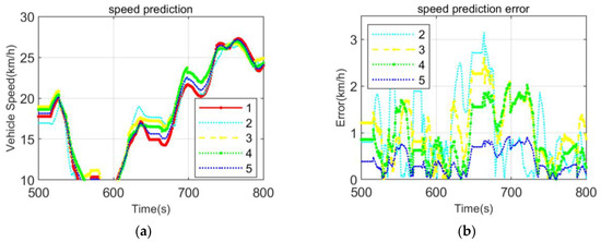 Partial magnification of speed prediction results. (a) Vehicle speed prediction; (b) Vehicle speed prediction error.