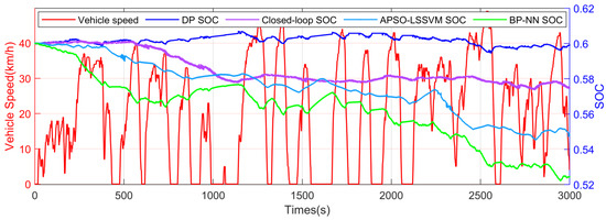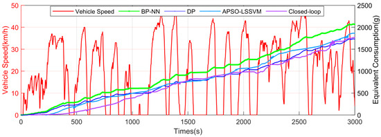 Figure 10 shows speed and distance, from which it can be observed that the driving distance is 16.49 km. Figure 11 shows the state of charge. Obviously, the SOC trajectory of DP-EMS is based on a global optimization algorithm for the global planning of power usage, in addition to the optimal SOC trajectory, is obtained, with a relatively slight variation. In contrast, other methods alternately utilize the charge depleting mode and the charge sustaining mode, which is attributed to the fewer global information about the driving cycle. Closed-loop-based EMS and APSO-LSSVM-based EMS show a gentle curve when the fuel cell engine runs with maximum efficiency. Since BPNN-based EMS has a relatively large variation, there is a nearly linear decrease. As can be observed in Figure 12 and Table 6, with a global optimal algorithm used, DP achieves the best hydrogen economy with an equivalent fuel consumption of only 10.5 kg/100 km. The closed-loop vehicle speed prediction system based ECMS, which has the best accuracy of the prediction, achieved an equivalent fuel consumption of 11.23 kg/100 km, which is 6.95% higher than the DP algorithm and decreased by 5.6~10.9% compared with the low accuracy of speed prediction. Since BP-NN performs worst in speed prediction, the equivalent fuel consumption is 12.6 kg/100 km, and the APSO-LSSVM is better than BP-NN, with an equivalent fuel consumption of 11.9 kg/100 km.