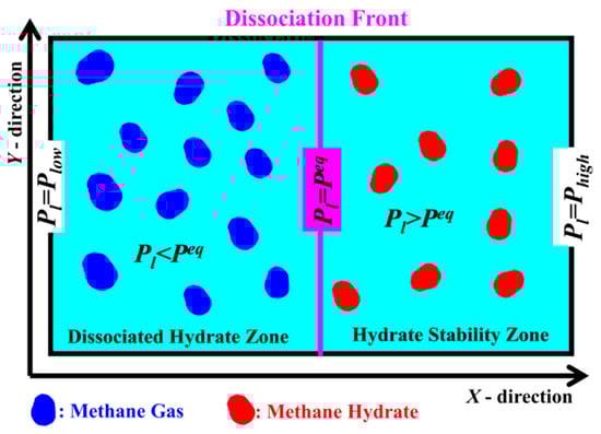 Regarding the liquid pressure, , which also corresponds to the pore pressure (used interchangeably in the current study) it was essential to obtain the pressure field in the domain of interest. Consider the schematic depicted in Figure 1, where a two-dimensional (2D) domain with a randomly distributed hydrate phase is shown. The entire domain is depicted as an effective porous medium, while the geometrical details of the pore network are not shown. Two characteristic zones can be identified; one zone where the pore pressure is , and, thus, no hydrate dissociation is possible, and a second zone where the pore pressure is , which corresponded to the area where hydrate dissociation is possible. The hydrate-dissociation front is part of the second zone and the following equality applies at the front: . It should be noted that the depiction of the “dissociation front” as a simple straight line in Figure 1 is a simplistic approach (needed for obtaining analytical solutions to the problem), indicating the presence of a zone where the hydrate had dissociated completely and a zone where dissociation had not occurred. However, in a realistic geological system, a “dissociation front zone” exists instead. The width of the particular zone can depend on the width of the pore size distribution that is present in the system. Furthermore, it should be pointed out that, in a real porous medium with pores that follow a pore size distribution, the dissociation front is expected to be a fractal object, rather than a straight line (note that it can reduce to a straight line if all pores are of the same size or, alternatively, in the absence of the porous domain). The particular problem bears similarities with the “liquid-to-gas” phase change problem that is encountered in the drying/evaporation of porous media, which has been discussed in detailed in [,,]. Additionally, it should be noted that P–T diagrams of real geological media, which also indicate the shift of the hydrate equilibrium curves, can be found in the studies of Liu and Flemings [] and De La Fuente et al. [].