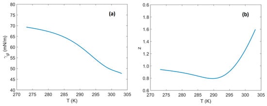 where is the gas (methane)/liquid (water) interfacial tension, z is the gas compressibility factor, R is the universal gas constant, is a parameter that is proportional to the amount of gas that is present in the hydrate cages, , and is a function that depends on the geometric characteristics of the porous system and discussed in detail in part I. Figure 2 shows the effect of temperature (and pressure) on the gas–liquid interfacial tension, (Figure 2a), and the compressibility factor, z (Figure 2b). The calculations shown in Figure 2 correspond to the bulk phase and are essential for Equation (2). The calculations shown in Figure 2 are performed at P, T conditions that correspond to the three-phase (H–Lw–V) equilibrium conditions for the binary system: methane + water.