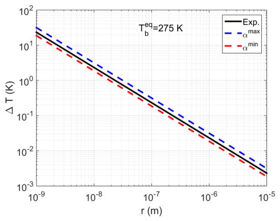 The effect of pore radius on the temperature depression (absolute) during methane hydrate dissociation in porous media. Results are shown for a temperature equal to 275 K. The solid line corresponds to the case of using variable parameters , , and , while the dashed lines correspond to the estimated minimum and maximum values for , based on the fixed values for the parameters in Table 1.