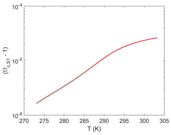 Figure 4 shows the correction term, , as a function of temperature, calculated along the three-phase (H–Lw–V) equilibria line for the methane + water binary system. We observe that the correction term has a very week dependence on temperature. Essentially, there is a change of only 0.002% between the minimum (at 275 K) and maximum (at 305 K) values of . Furthermore, for the case of S1 we observe that the term is approximately equal to one (i.e., for all engineering purposes), as is shown in Figure 5, where we plot as a function of temperature. We can observe that is in the range , for the temperature range 275 K–305 K. Therefore, the following approximation can provide accurate results for engineering-type calculations: