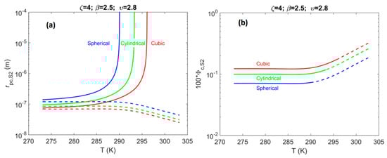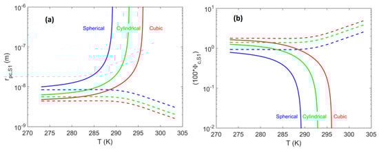 System of a single pore-body (i.e., system S1). (a) Effect of pore-body geometry (spherical—blue; cylindrical—green; cubic—red) on the critical pore-body radius, , plotted as a function of temperature along the three-phase (H–Lw–V) equilibrium line for the methane + water system (modified from Tsimpanogiannis []). (b) Effect of pore-body geometry for system S1 on the value of , plotted as a function of temperature along the same three-phase equilibrium line. Solid lines correspond to pores located at the hydrate-dissociation front , while the dashed lines correspond to pores at minimum pore pressure for well production via a pressure depletion scheme.