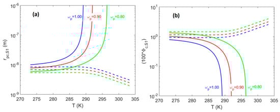 System of a single spherical pore-body (i.e., system S1). (a) Effect of the remaining liquid film thickness inside a spherical pore on the critical pore-body radius, plotted as a function of temperature along the three-phase (H–Lw–V) equilibrium line for the methane + water system (modified from Tsimpanogiannis []). (b) Effect of the remaining liquid film thickness inside a spherical pore on the value of , plotted as a function of temperature along the same three-phase equilibrium line. When there was no liquid film on the pore-body wall. Solid lines correspond to pores located at the hydrate-dissociation front while the dashed lines correspond to pores at minimum pore pressure for well production via a pressure depletion scheme.