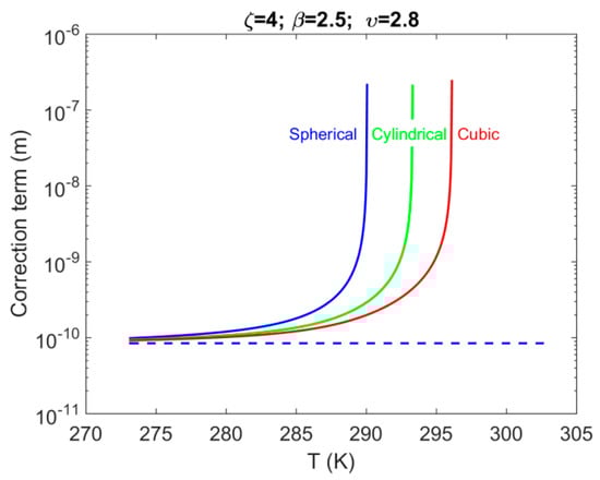 We observe that, even though the correction term, , increases by more than three orders of magnitude between 273 K and 305 K, the term , increases also by approximately the same orders of magnitude. Therefore, the ratio , remains essentially constant in the temperature ranges 273 K–293 K, while increases slightly for temperatures higher than 293 K. Notice, however, that in all cases the correction term, , is less than 0.5% of the total value of . It is also observed that pores that are located at the hydrate dissociation front exhibit the same shift with those pores that are located at points of minimum pressure. Furthermore, it should be pointed out that there is an asymptotic behavior for the case of pores located at the front (see Figure 10a), and it’s effect is clearly shown in Figure 10b, where we observe that the resulting curves are plotted only up to 291 K (spherical pore-body), 293 K (cylindrical pore-body), and 295 K (cubic pore-body), respectively, for the three pore-body geometries that are considered in the current study. For the three particular cases the magnitudes of the shift are having values in the following order: cubic > cylindrical > spherical.