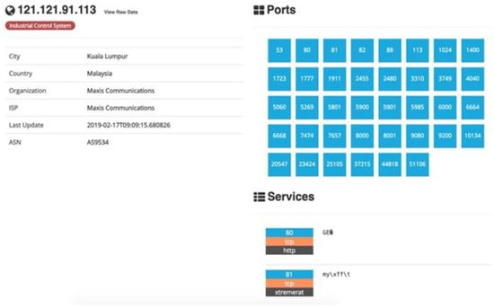 Shodan is a search engine that is employed to find systems that are associated with the internet [,,,]. It differs from other famous search engines, like Yahoo, Bing, and Google, in that it searches for systems that are connected with the internet. Misconfiguration errors are revealed when devices or systems are visible on Shodan. Shodan scans the network for connected devices. It looks for accessible terminals, and a customer can use Shodan to look for specific facilities that run on a certain host. As an outcome, if a single IP address hosts many services, Shodan displays a list of all available services at that address. An illustration of a Shodan search outcome is shown in Figure 2.