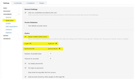 The Nessus tool is employed to do vulnerability analysis and host discovery on discovered hosts, as well as to provide an outline of the identified vulnerability and the method to fix it [,,,,,,]. Nessus has the capability to continually test each method employed to build internal services in order to uncover potential susceptibilities based on host replies to each probe and request. The vulnerability signature is then compared to the Nessus database to discover probable flaws (Figure 3).